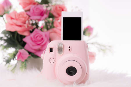 BANGKOK, THAILAND - OCTOBER 09, 2019: The pink Fujifilm Instax mini 8 instant camera on blue background.