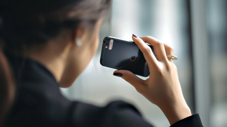 Black cellphone in womans hands on coral pink background. Flat lay lifestyle concept. Taking picture on camera with mobile phone.