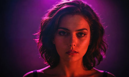 A woman with dark hair stares intently into the camera, bathed in red and purple light