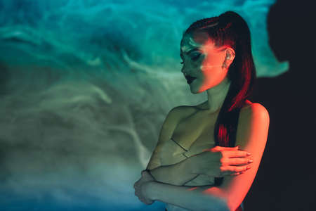 Feminine nature. Silhouette portrait. Inner ocean. Tranquil energy. Glamorous beautiful woman posing double exposure deep geen water universe waves flow light shadow copy space.