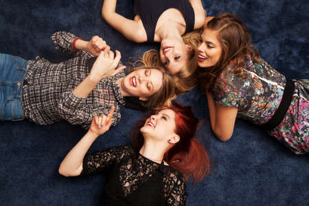 Three beautiful young women in elegant evening dresses posing against the background of stars.