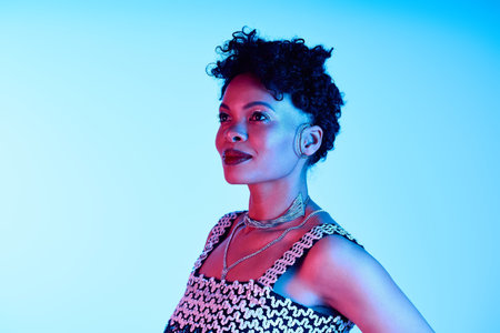 A confident African American woman poses under vibrant blue lights, showcasing her style.