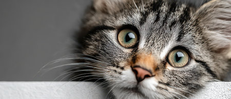 Banner with gray shorthair domestic tabby cat in front of white background. Domestic animal. Selective focus.