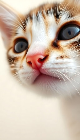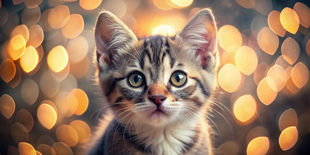 Close up of a cute kitten with captivating eyes gazing upwards, its delicate features and soft fur highlighted by warm lighting, creating a heartwarming scene of innocent curiosity