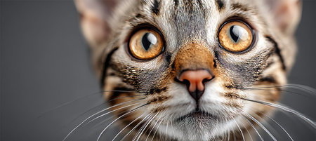 Charming Tabby Cat Portrait with Expressive Eyes and Playful Gaze on a Simple Grey Background