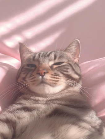 Cute tabby cat lying on pink bedding in sunlight.