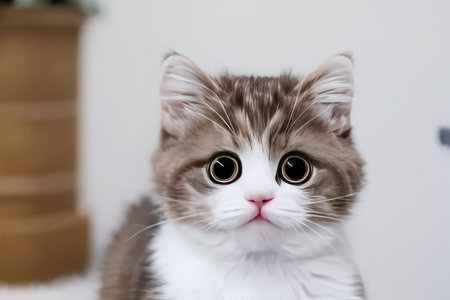 AI Generated. Curious Cat with Big Eyes Staring in Front of Wooden Background
