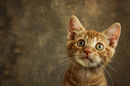A charming orange cat with large, expressive eyes gazes curiously upward. Its playful and attentive demeanor captures the essence of feline innocence and charm.
