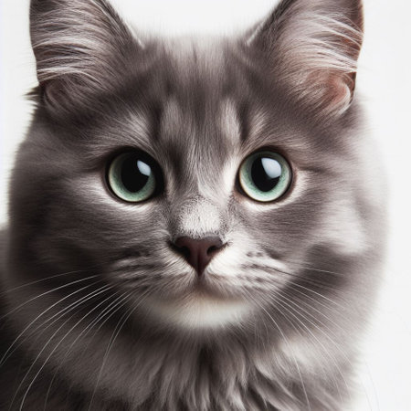 Portrait of a beautiful gray cat with green eyes on white background
