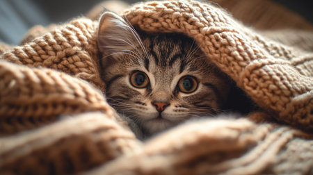 A charming kitten wrapped in a soft knit blanket, showcasing its playful expression and big eyes. This delightful scene evokes warmth, comfort, and tranquility.