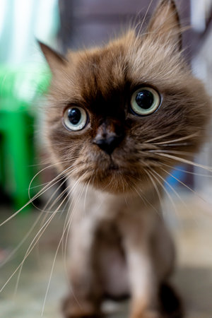 Temperamental british domestic cat looks at you closeup with blurred background.