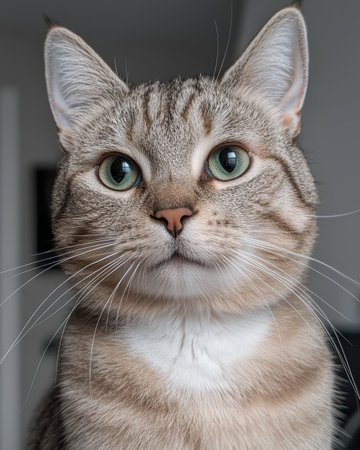 Close-up portrait of a beautiful tabby cat with striking green eyes