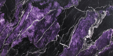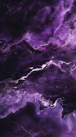 A dark marble texture with rich purple and black tones, contrasted by bold silver veins.