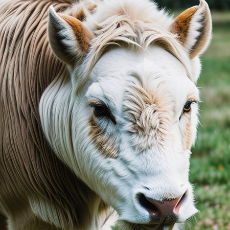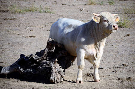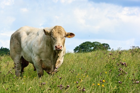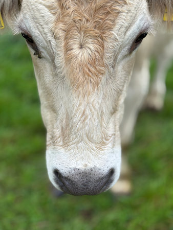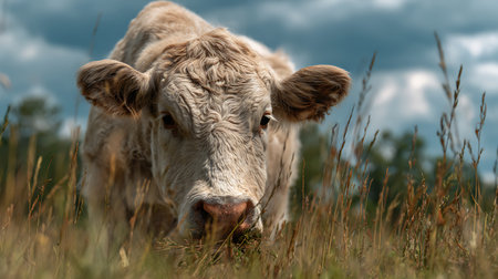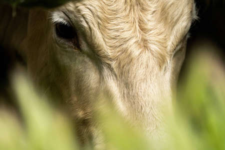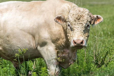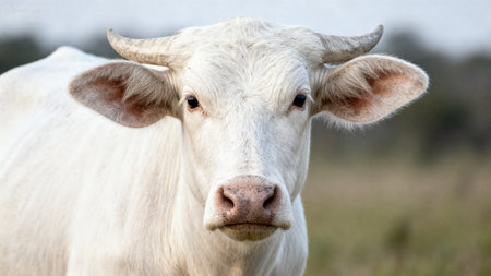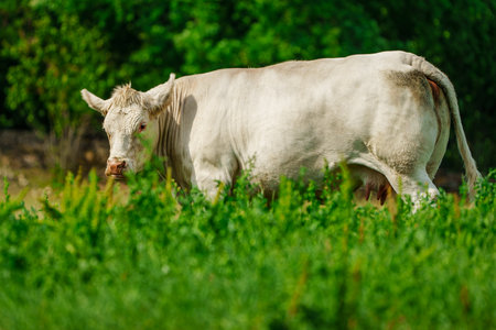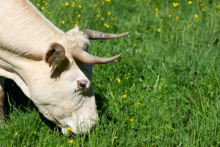 Picturesque view of a white bull grazing looking towards the camera, with copy space