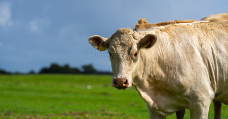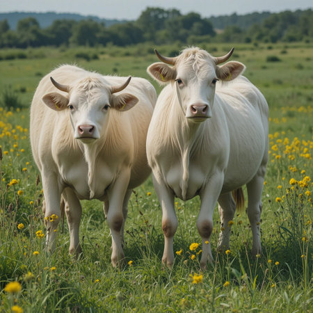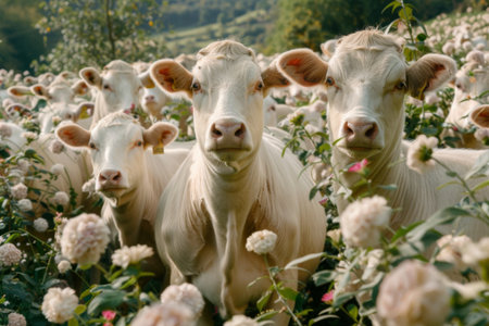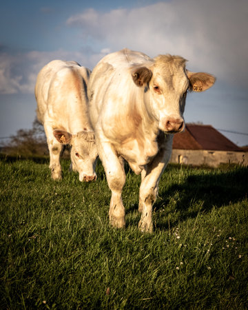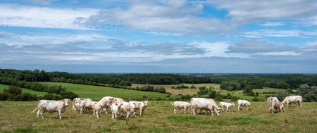 Charolais cattle grazing. Majestic French Charolais cows gracefully roaming in a picturesque meadow