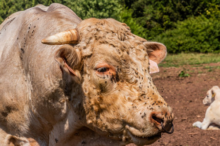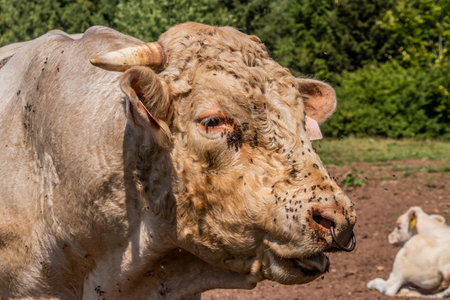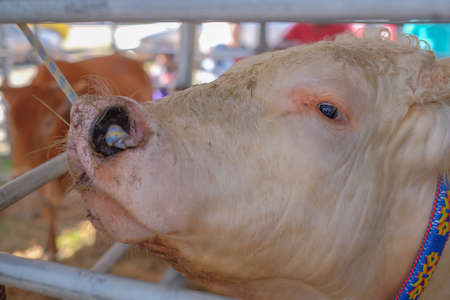 Portrait of large white Charolais or Charolaise bull lying on ground at agricultural animal exhibition, cattle trade show - french breed, close up, side view. Farming, agriculture industry concept