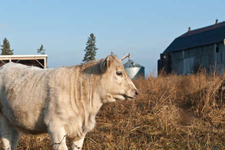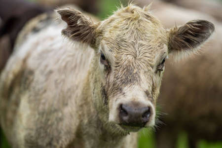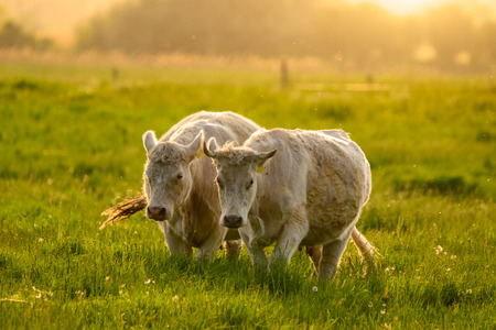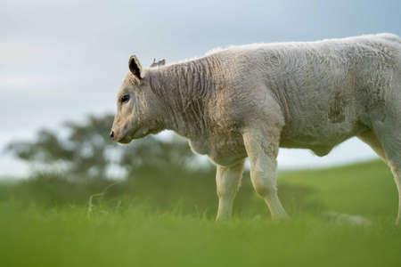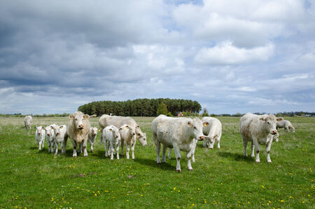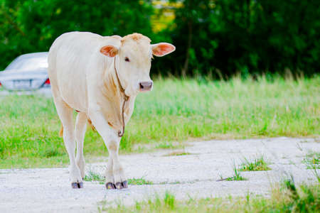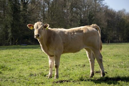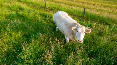 Cows in the pasture. White cattle living outdoors in nature. Meat breed. Young cow.