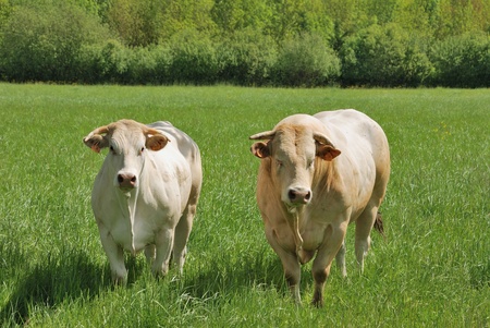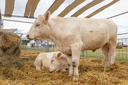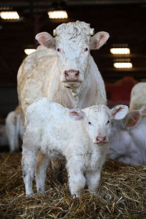 Blonde d'Aquitaine cattle cows on dairy farm, domestic animal husbandry