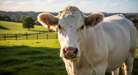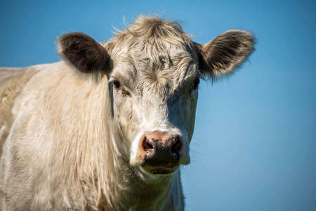 Portrait of white cow standing in a meadow looking camera on blue sky background