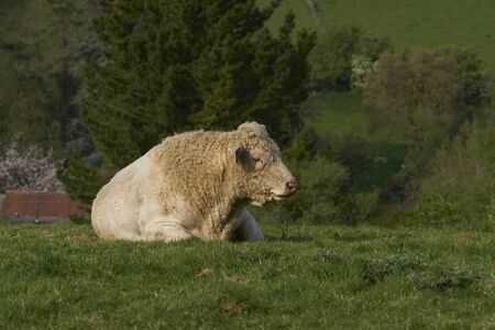 Bull lying down in a lush green field in the Woolley Valley, an Area of Outstanding Natural Beauty in the Cotswolds on the outskirts of Bath, England, United Kingdom