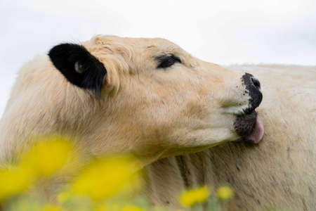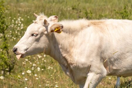 A young white bull cow stuck out its tongue with horns grazing in a green meadow with white flowers. The year of the Bull is 2021. Agriculture and animal husbandry, dairy products.
