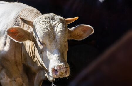 Horned beef head in animal farm. Turkey calf sale in the feast of sacrifice