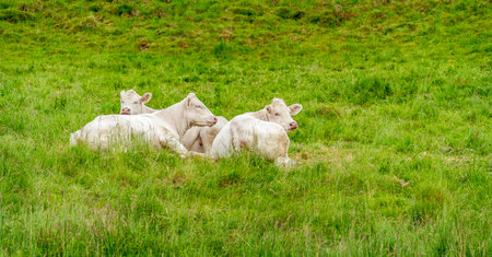 Some resting white cows on a meadow seen in the Black Forest in Southern Germany at summer time