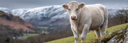 Charolais Cow Standing Proudly in Hilly Pasture, Showcasing Muscular Build with Mountains Behind