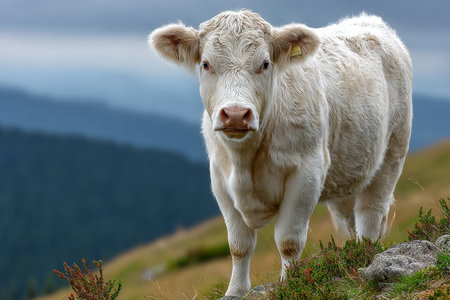Majestic blonde Charolais cow grazing in lush hilltop pastures against stunning mountainous backdrop