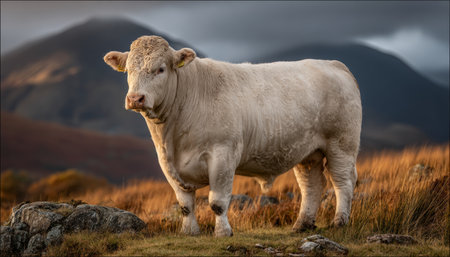 Mighty Charolais Bull Standing Proudly in Meadow Against Dark Hills Under Gloomy Grey Skies