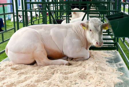 Bull of breed Belgian blue, resting in a stall at an agriculture exhibition