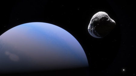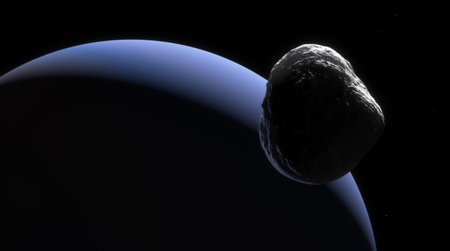 Spacecraft orbits Neptune, providing a clear view of the planets blue and white atmosphere and its moon. 3d render