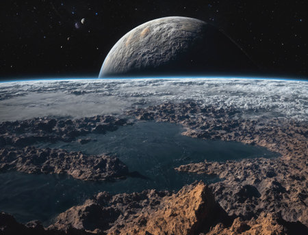 science fiction wallpaper, cosmic landscape, realistic exoplanet, beautiful alien planet in far space, detailed planet surface 3d render