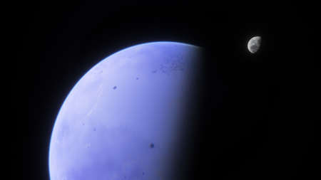 This image is a concept of the Makemake dwarf planet his small moon MK2 in a precise and scientific artwork design.This is a 3d rendering.