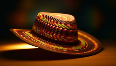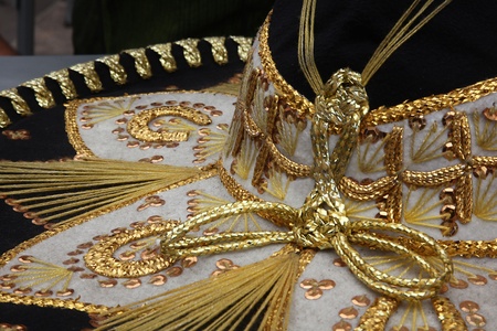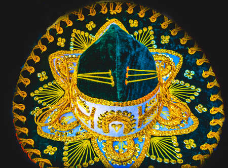 Close up of traditional festive mexico hat with gold details, mexican culture concept.