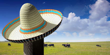 Sobrero mexican hat shade sun protection, green field pasture with cattle and sky with clouds background. 3d illustration