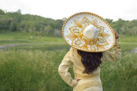 Woman wearing typical Mexican charro costume. Woman with Mexican hat seen from behind.