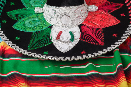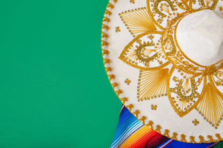 Mariachi hat and serape on green background. Mexican independence concept. Cinco de mayo background.