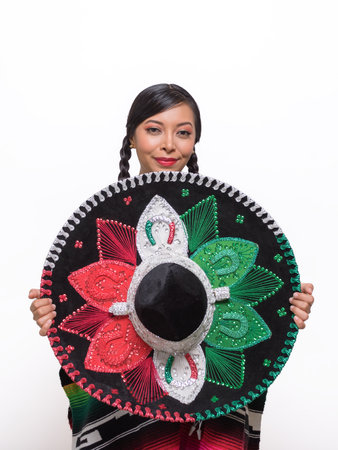 Studio portrait of person wearing charro hat. Typical Mexican hat with colors of the flag.