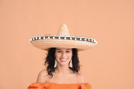 Beautiful woman in sombrero hat on color background