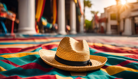 A straw hat with a colorful ribbon lies on a bright fabric background creating a festive and vibrant image