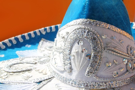 charro mariachi blue mexican hat detail over orange background Mexico