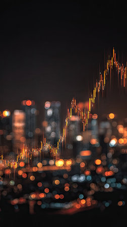 An abstract image shows a financial graph overlaid on a blurred cityscape at night. The graph, rendered in shades of gold and orange, rises and falls, suggesting market fluctuations. The city lights below provide a bokeh effect. This image is suitable for various commercial applications, including financial reports and business presentations.