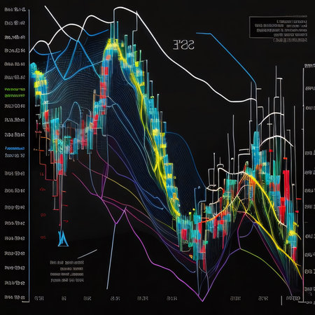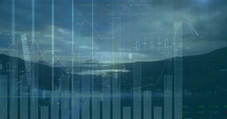 Displaying trading view overlaying coastline at dusk, with chart elements, stock tickers, gridlines. Financial, technology, minimalist, analytics, investment, digital, coastal