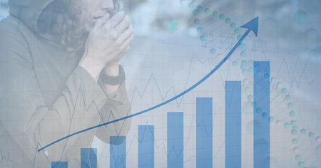 Digital illustration of a woman walking on a street, coughing over data processing, statistics showing in the background. Medicine public health pandemic coronavirus Covid 19 outbreak concept digital composite.