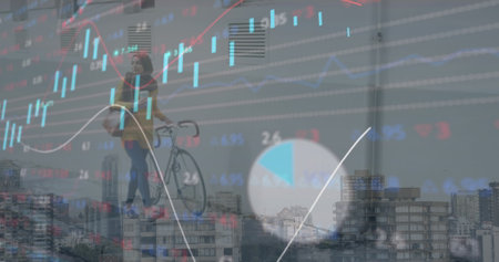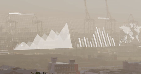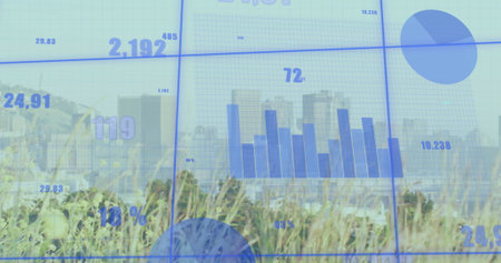 Image of charts processing data over cityscape. Data, digital interface, network, connection, business, processing and communication, digitally generated image.