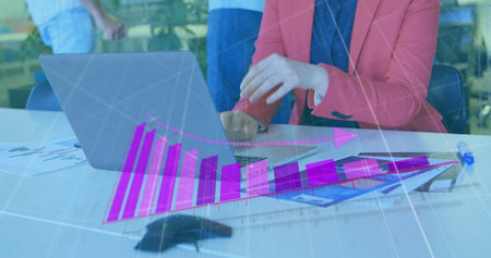 Image of graph over midsection of caucasian businesswoman working over laptop on desk in office. Digital composite, business, report, loss, infographic, hands, technology concept.