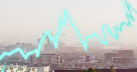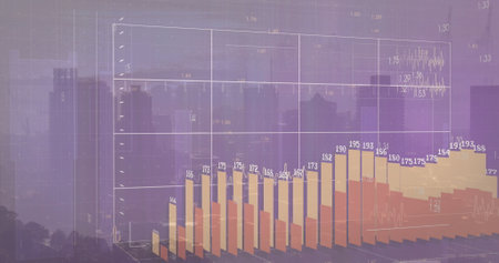 Image of statistics and financial data processing over cityscape. Global business, finances, computing, networks and data processing concept digitally generated image.