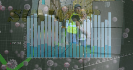 Image of financial data processing and virus cells over diverse workers in warehouse. Global shipping, delivery and digital interface concept digitally generated image.