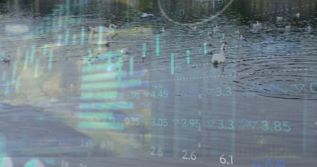 Image of stock market and diagrams over swans on river. Global business, nature and digital interface concept, digitally generated image.
